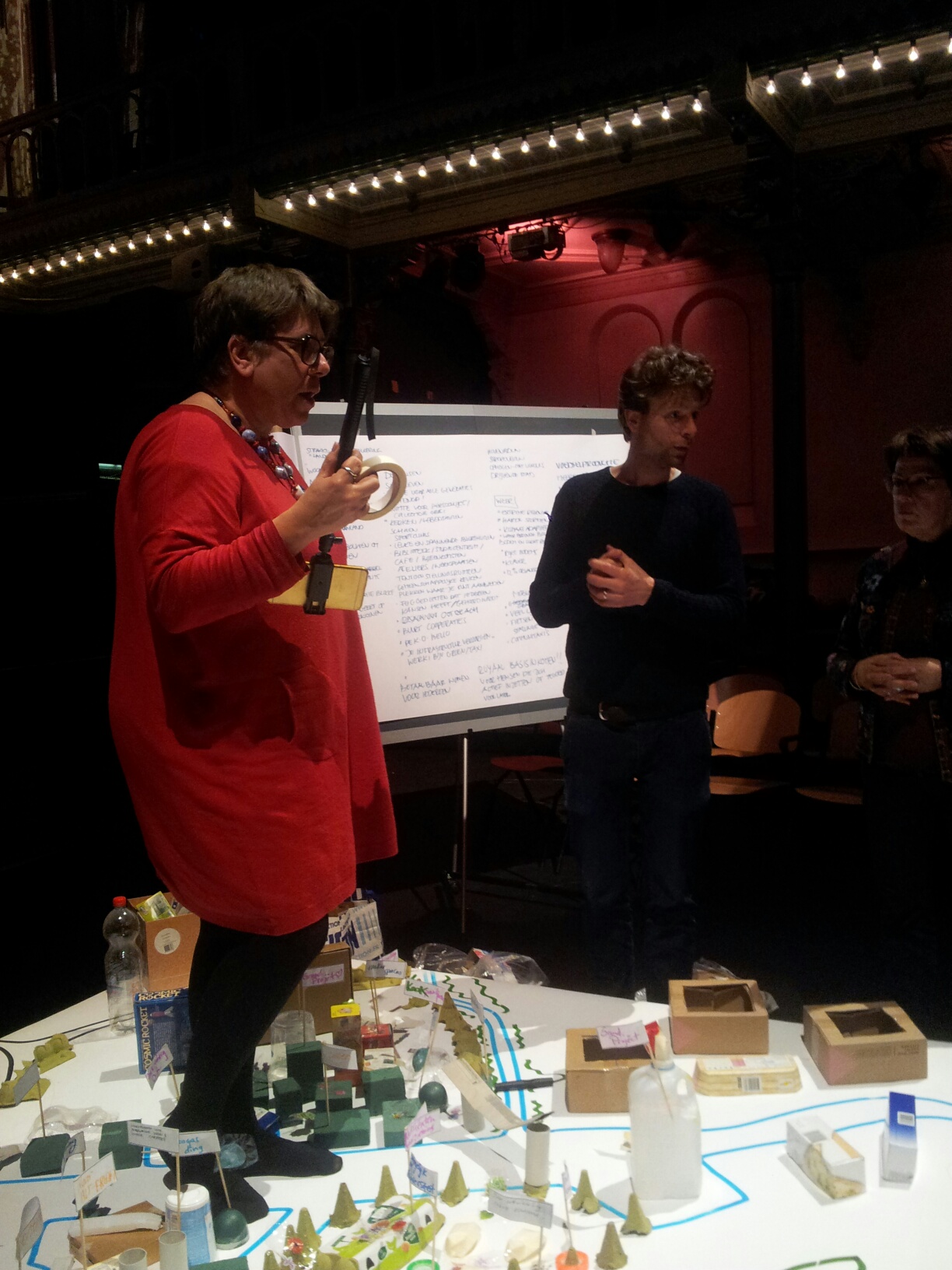 We verzamelen ons rond de rebelse maquette van het westelijk havengebied waarmee we de ontwerpprincipes van de stad tastbaar maken. De grote zaal van Paradiso vormt het decor voor een openbaar stadsonderhoud waarin we hardop dromen over de stad als Gesamtkunstwerk, waarvoor iedere bezoeker bouwstenen kan aandragen.